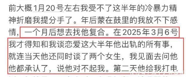 其二是女方调查核实查明男方出轨详情,发现男方与至少三个女生存有暧昧关系,不限于发现男方脖子上有草莓印等证据,查岗被糊弄,还被单方面删除联系方式,女方忍无可忍主动提分手。时隔一个月女方反悔又主动提复合,彻底明了荣梓杉劈腿实情,男方承认与她恋爱期间还谈了另外两个女朋友,并向女方道歉认错求和。