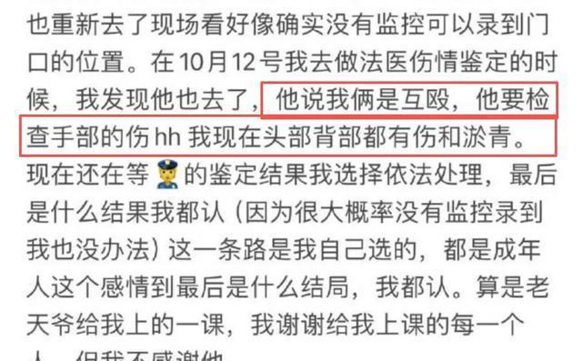 两人约见面沟通,结果就有了殴打女生的事,致女方头部、肩部受伤。荣梓杉见女方报警立案后又秒怂,卖惨求和无果后试图将女方控告的殴打模糊成互殴,搅浑水。