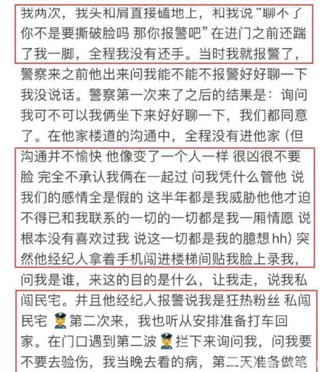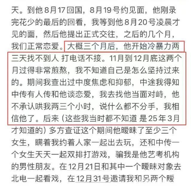 其三,荣梓杉承认出轨后一个星期又反悔了,冲到女方家发疯,自导自演录音“没谈恋爱”,拿经纪公司威胁女方及亲属,发现硬的不行后又调整策略,采用柔化策略哄骗女方原谅,女方看他低声下气认怂后决定和好。而这之后的半年里双方没见面,荣梓杉拿着生病、读书、进组等借口推托见面,一见面荣梓杉又承认出轨一个上戏女生,还试图拿童星挡枪,最终矛盾爆发。